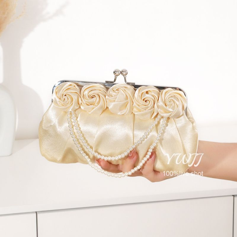 Borsa a mano in stile francese con perle, vintage, cheongsam, borsa da sera in raso con fiori di rosa 3D, da sposa