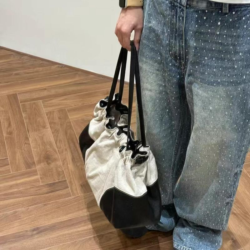 Pleated Handbag Drawstring Patchwork Women's Shoulder Bag Large Capacity Bucket Bag 2025 New