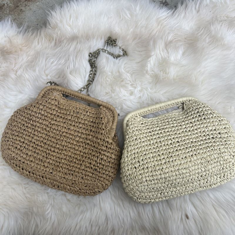 Borsa a mano versatile Niche con clip, tracolla a catena lunga, borsa da donna due in uno in carta di paglia lavorata all'uncinetto