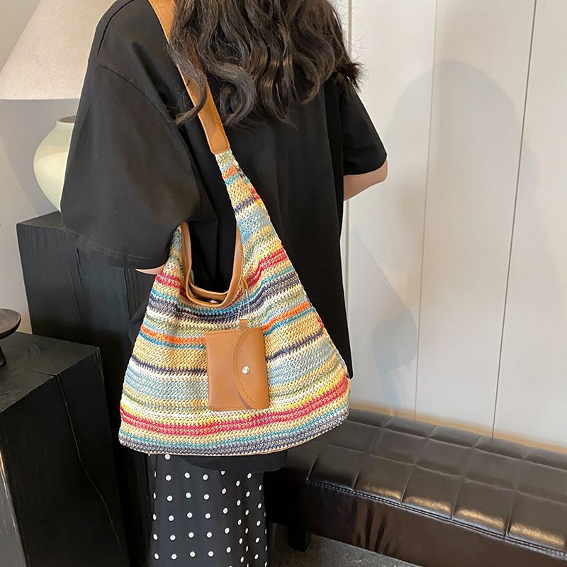 Summer Large Capacity Rainbow Straw Bag for Women 2024 New Fashion Commuter Shoulder Bag Handheld Tote Bucket Bag