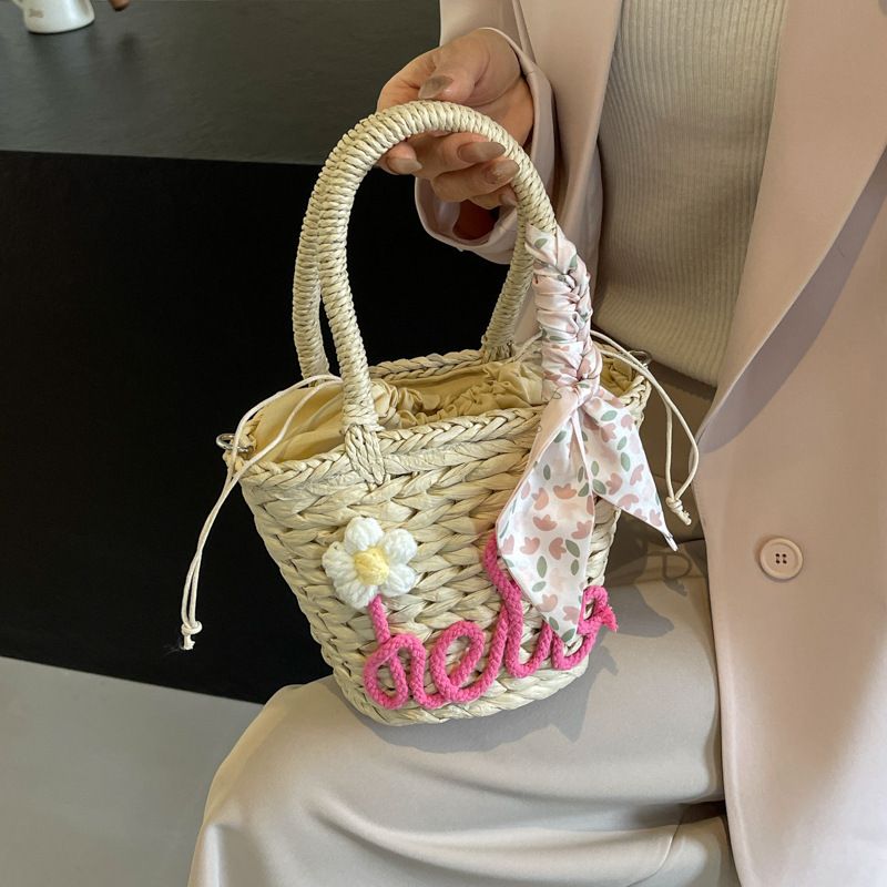 Borsa a secchiello intrecciata a mano per donna, primavera estate 2024, nuova moda, borsa a tracolla singola, borsa a mano in paglia casual di alta qualità