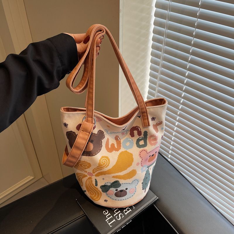 Minimalist Textured Artistic Bucket Bag for Women 2025 New Cute Cartoon Print Fabric Bag Casual Personality Shoulder Bag