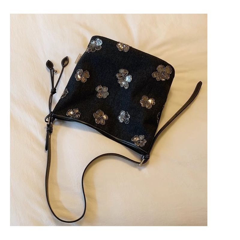 2025 Hot-Selling Starlight Dreamland Tote Bag Black Denim Shoulder Bag for Women with Glitter Flowers Crossbody