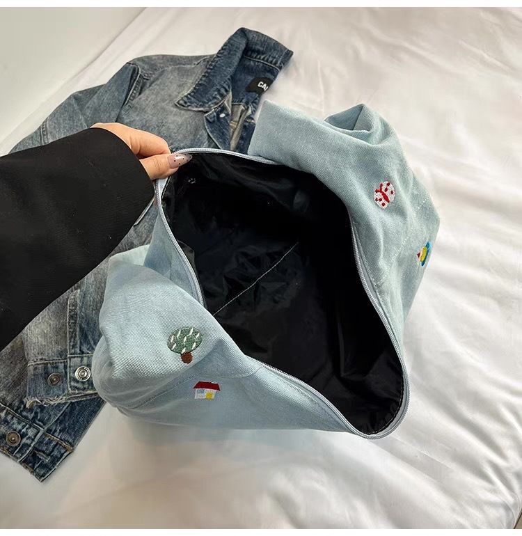 Borsa a tracolla in tela di grande capacità, nuova, autunno/inverno 2025, in denim blu ricamato, da donna