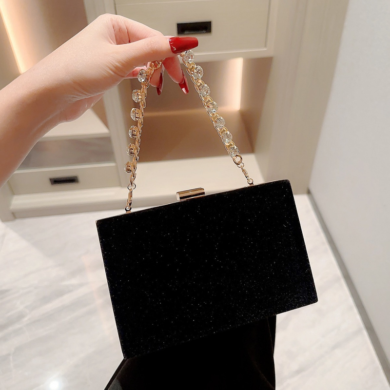 French Style Black Velvet Bag with Rhinestone Chain Handbag Socialite Small Square Bag Evening Bag Dress Bag