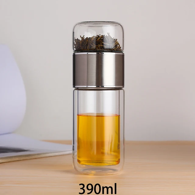 Bottiglia d'acqua per il tè da 390 ml, in vetro borosilicato ad alto spessore, a doppio strato, con infusore, tumbler, per bevande, con filtro per il tè