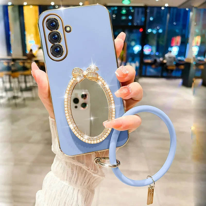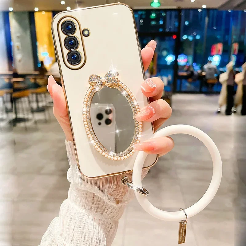 Bow Oval Mirror Case For Samsung A05S A73 A21S A34 A12 A54 A25 A33 A24 A32 5G A23 A53 A13 4G A14 A04S Wristband Bracelet Cover