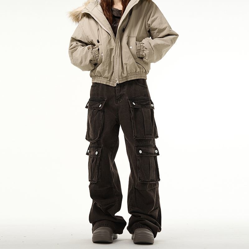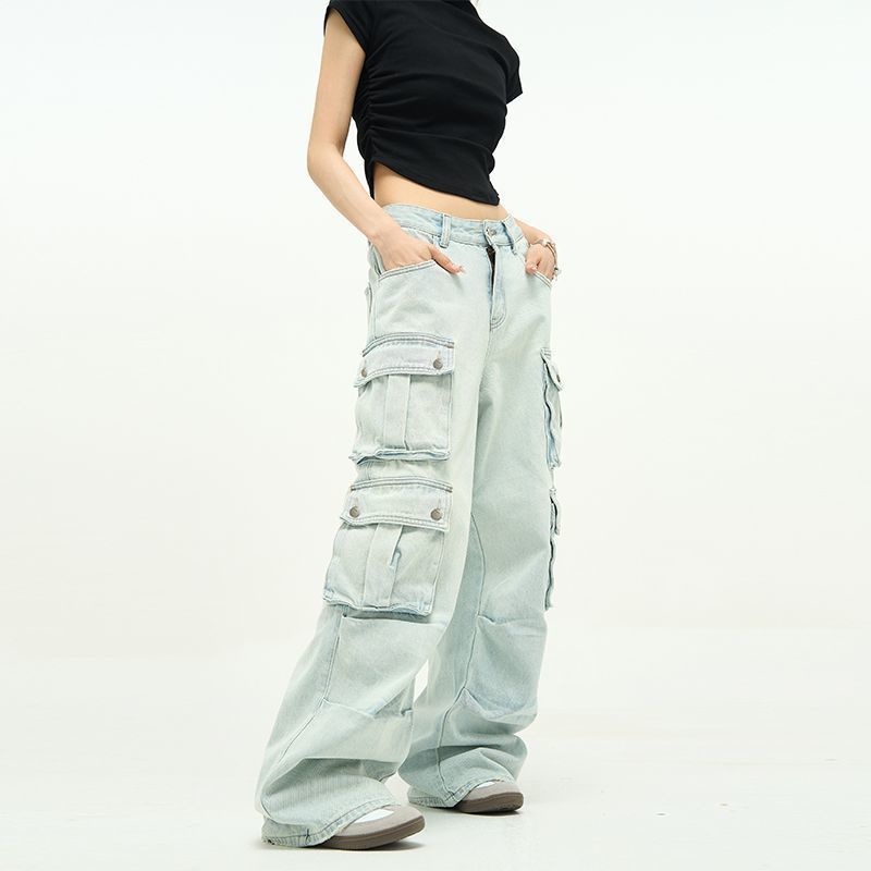 Jeans multitasche stile boy per uomo, pantaloni cargo a gamba larga blu retrò di nicchia, pantaloni alla moda europei e americani per coppie