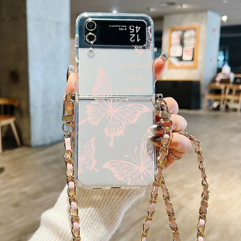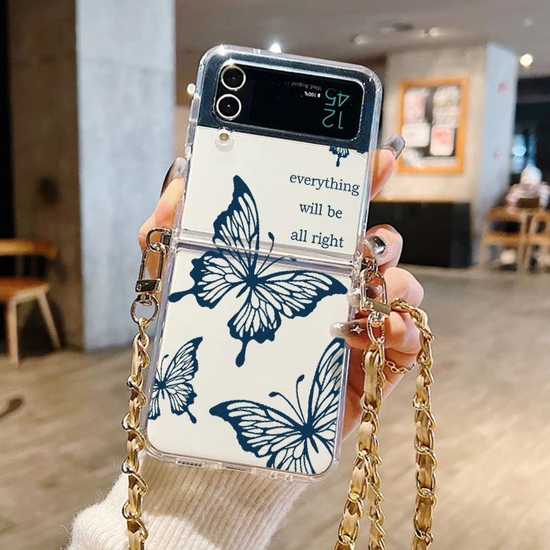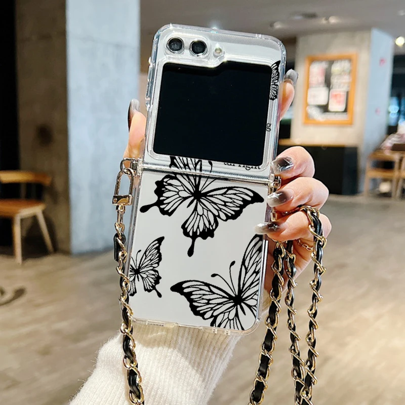 Custodia con cordino in metallo con stampa a farfalla per Samsung Galaxy Z Flip 6 5 4 3 5G Custodia trasparente pieghevole in silicone TPU per Samsung Z Flip5