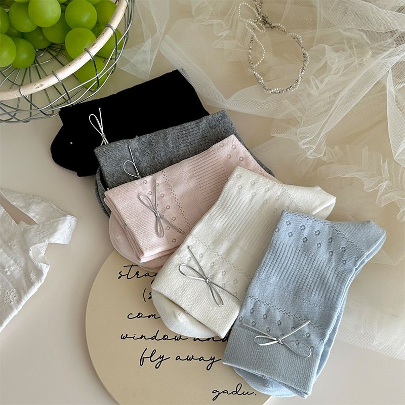 Leather Bowknot Seamless Socks for Women, Mid-Calf Socks, Spring and Summer Sweet Mesh Thin Pile Socks for Women, Summer Women's Socks