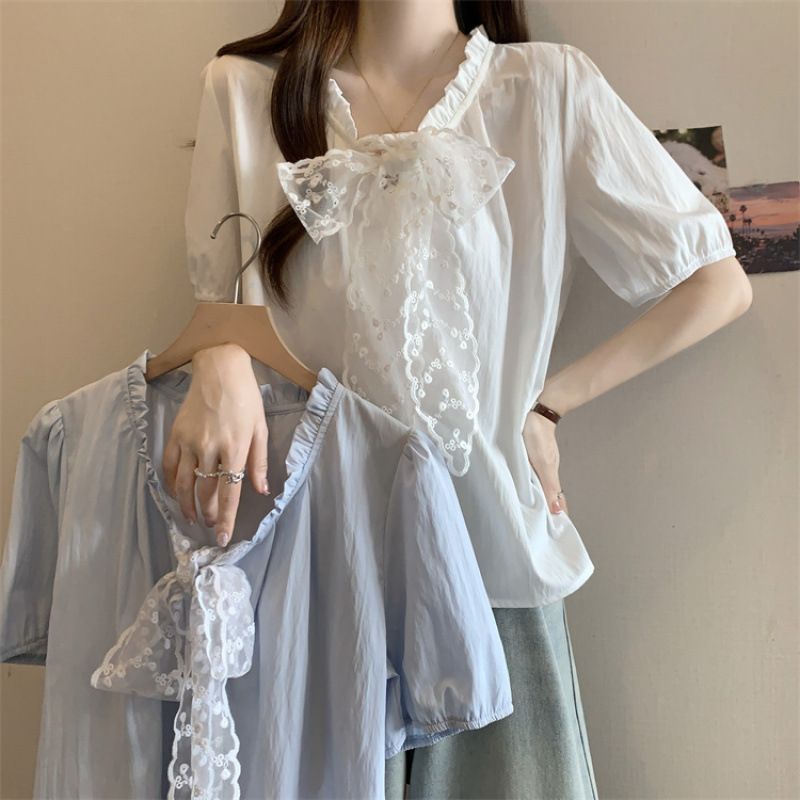 Camicia a maniche corte con scollo a V, fiocco e pizzo da donna Design Sense Ruffled Top