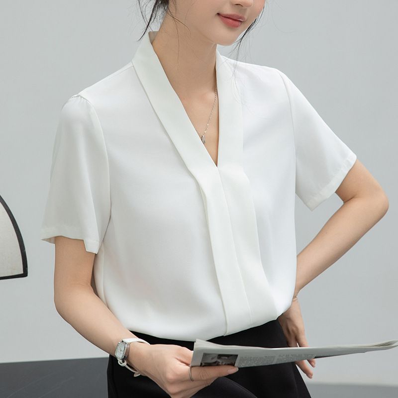 Camicia a maniche corte in chiffon con scollo a V bianco Real Shot, abito da pendolare professionale, camicia interna per colloqui