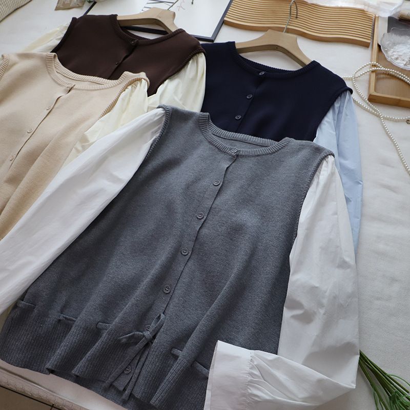 2025 Autumn New Korean Style Knitted Patchwork Fake Two-Piece Color-Block Elegant Versatile Long Sleeve Shirt for Women 4852