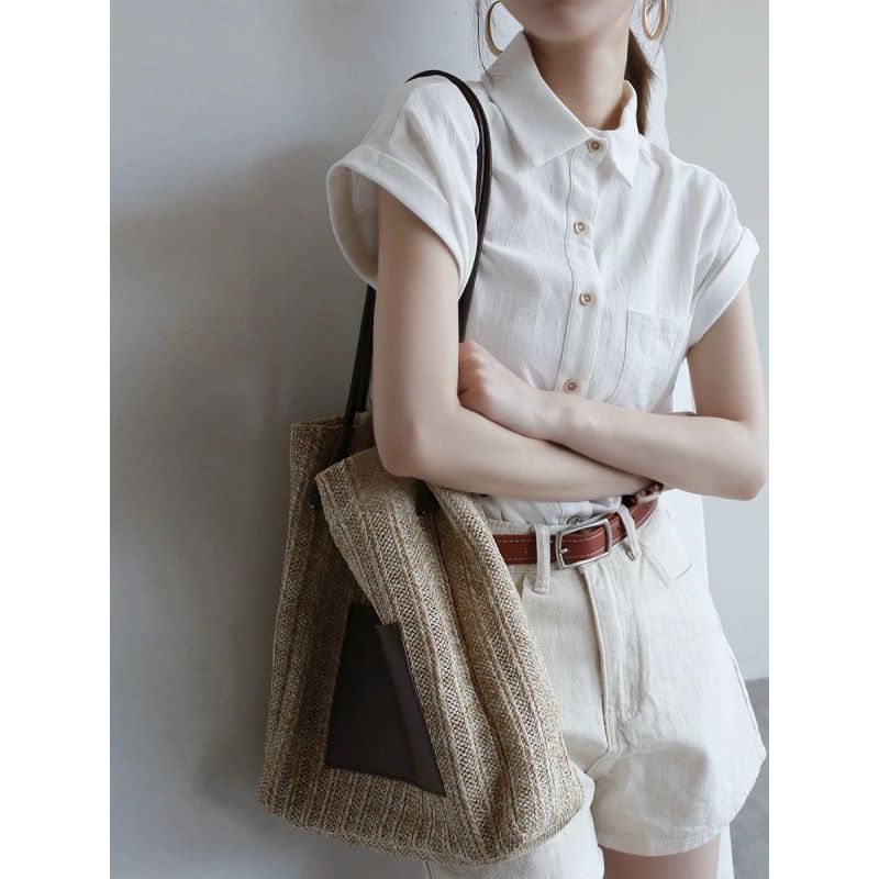 Camicia bianca estiva traspirante a maniche corte in cotone e lino per le donne che si spostano sul posto di lavoro con maniche a palloncino
