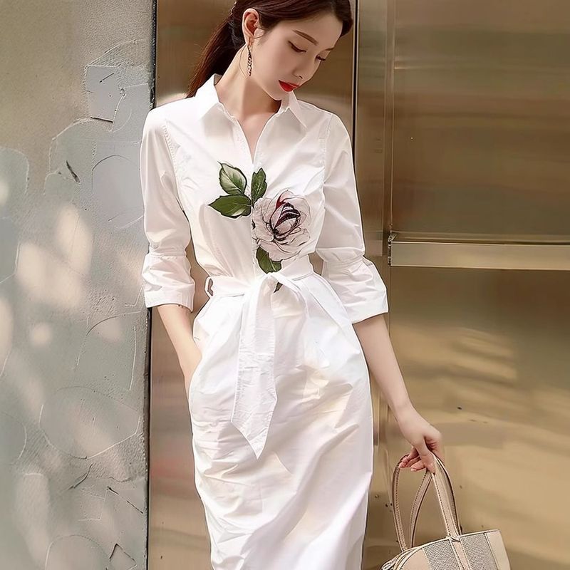 Bargain White Printed Shirt Dress for Women 2025 New Summer High-End Trendy Dress