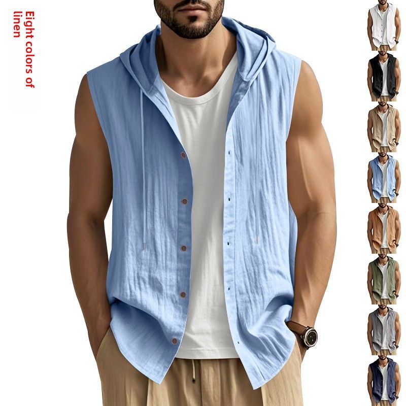 Camicia casual estiva da uomo senza maniche in lino con cappuccio, tinta unita, traspirante, ampia