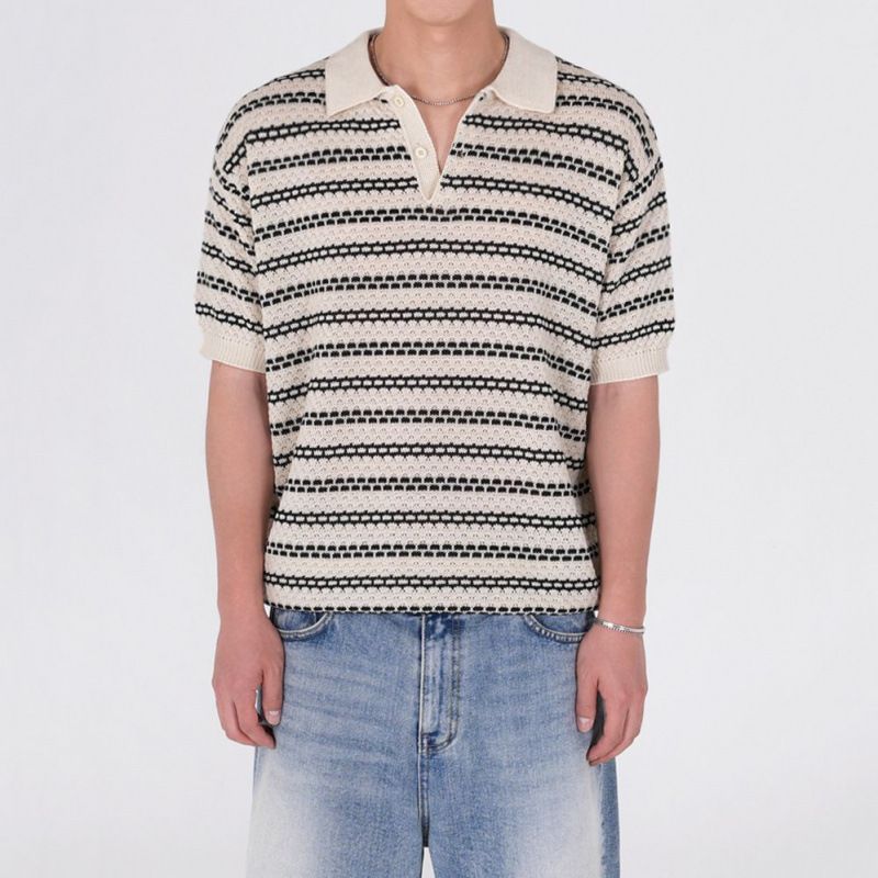 MYQ Old Money Style Striped Short Sleeve Knit Shirt for Men Summer Thin Breathable Turn-Down Collar Half Sleeve Korean Commuting Outfit