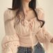 Camicia corta in chiffon con maniche a tromba e colletto quadrato, con cinturino a forma di fungo, stile coreano chic per l'inizio della primavera 2024