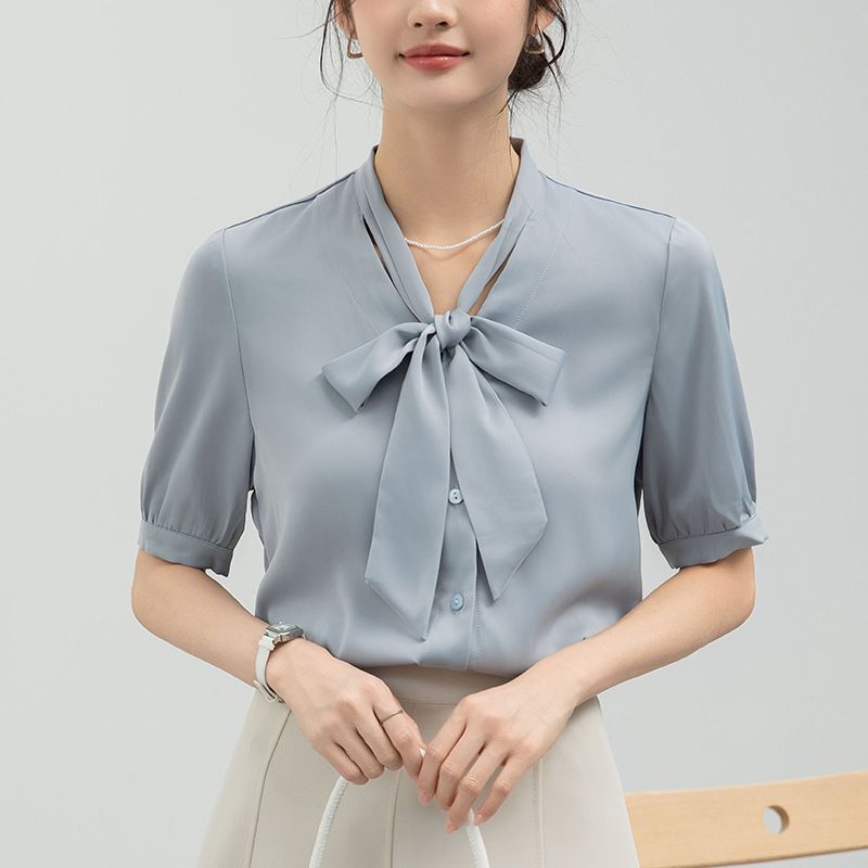 Camicia da donna con fiocco blu Real Shot, manica a sbuffo, piccola, in raso, a maniche corte