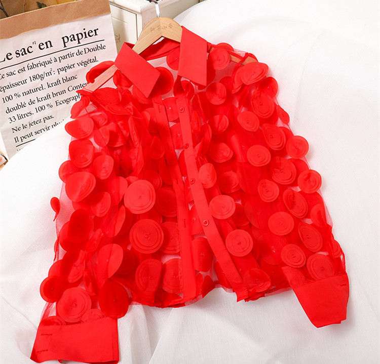 Camicia in chiffon da donna con fiori tridimensionali in stile palazzo francese, camicia a rete in stile straniero con maniche a lanterna cava per donna