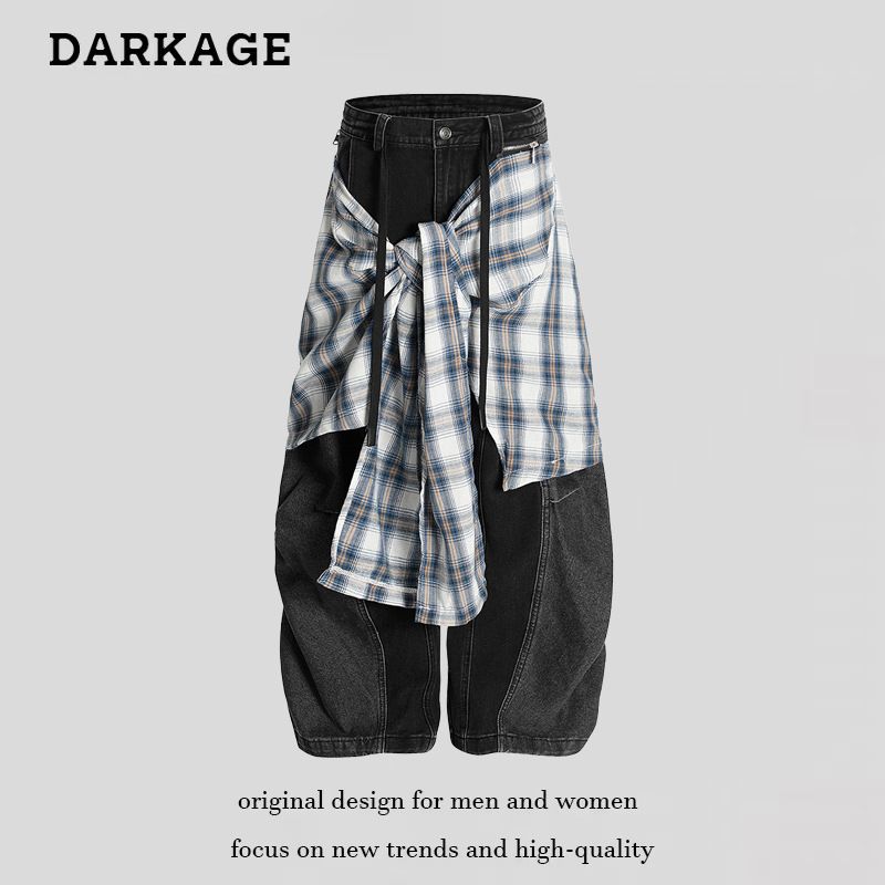 American Style Fake Two-Piece Detachable Shirt with Curtain Patchwork Jeans for Men and Women Loose Wide-Leg Straight Long Pants