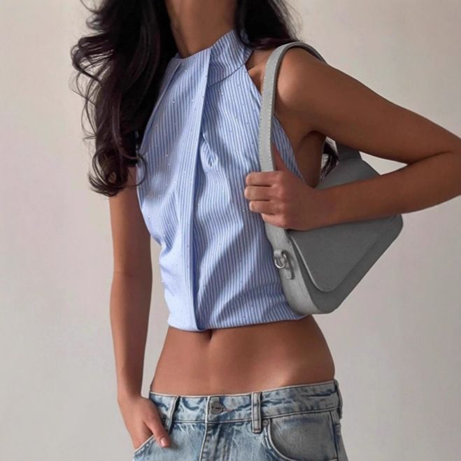 Sexy Rhinestone Striped Halter Neck Tank Top for Women 2025 Autumn Design Short Outerwear Hot Girl Waist-Cinching