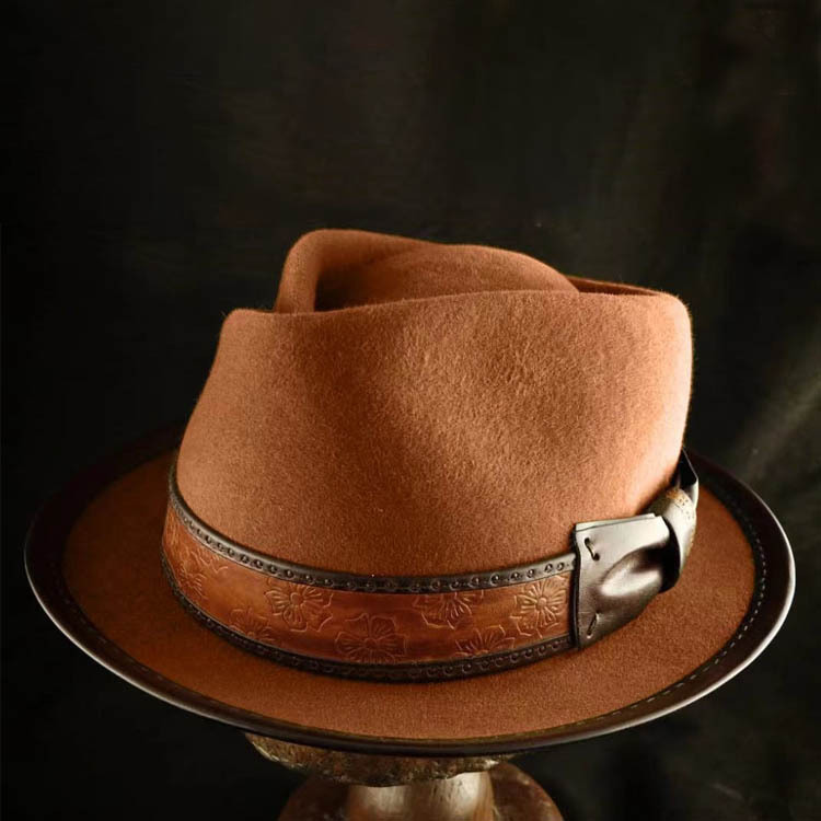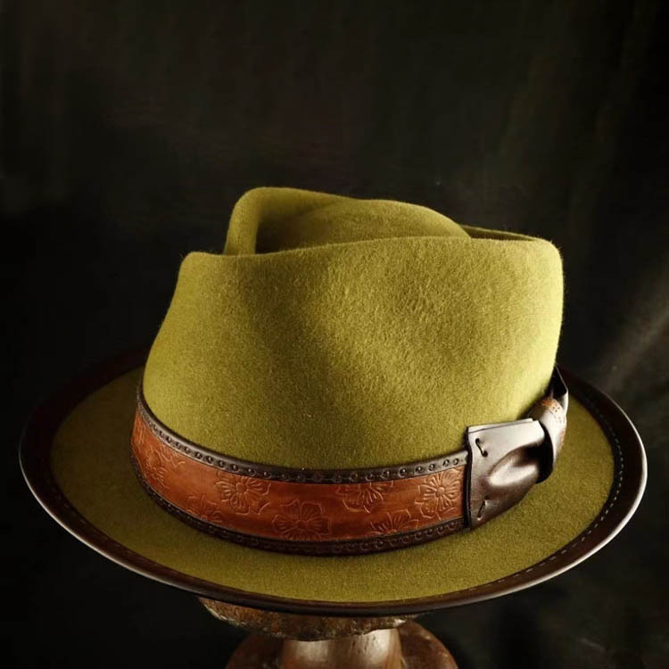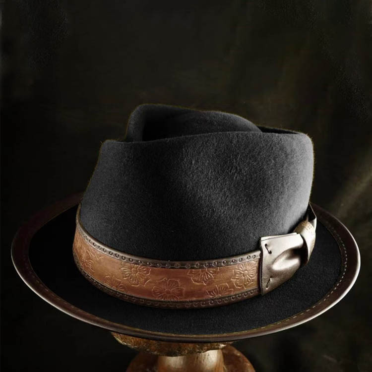 Cappello con rifiniture in pelle molto venduto, cappello a cilindro alla moda in pura lana