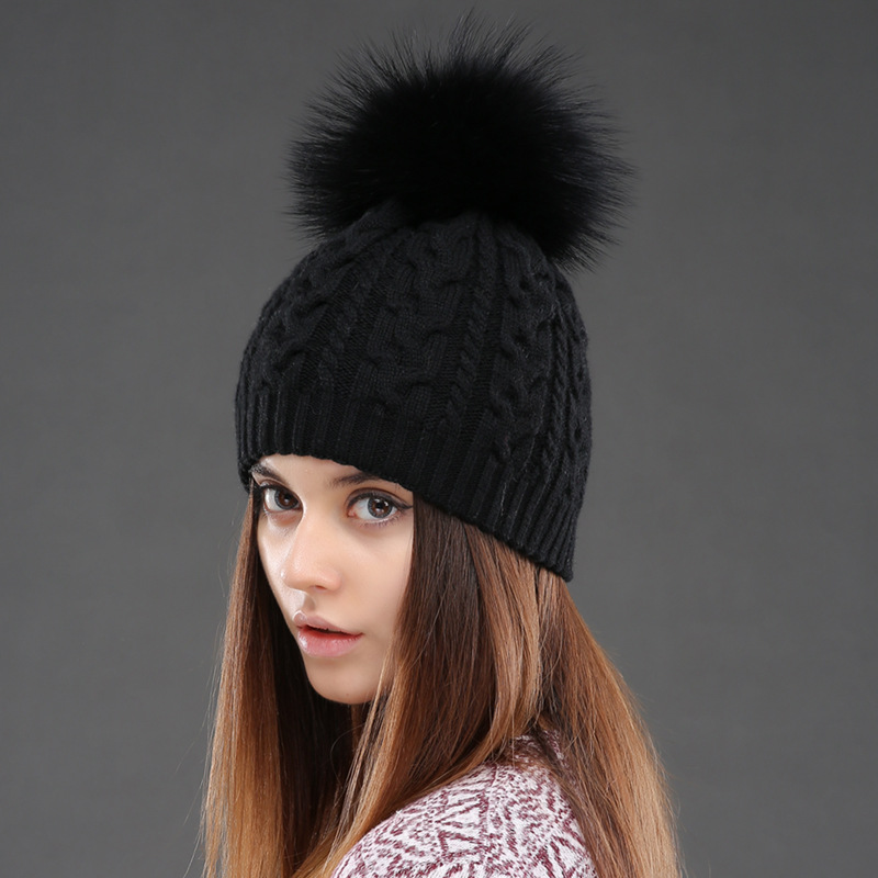 Wool hat women's double-layer winter warm Fried Dough Twists knitting pullover hat real raccoon dog wool ball wool hat