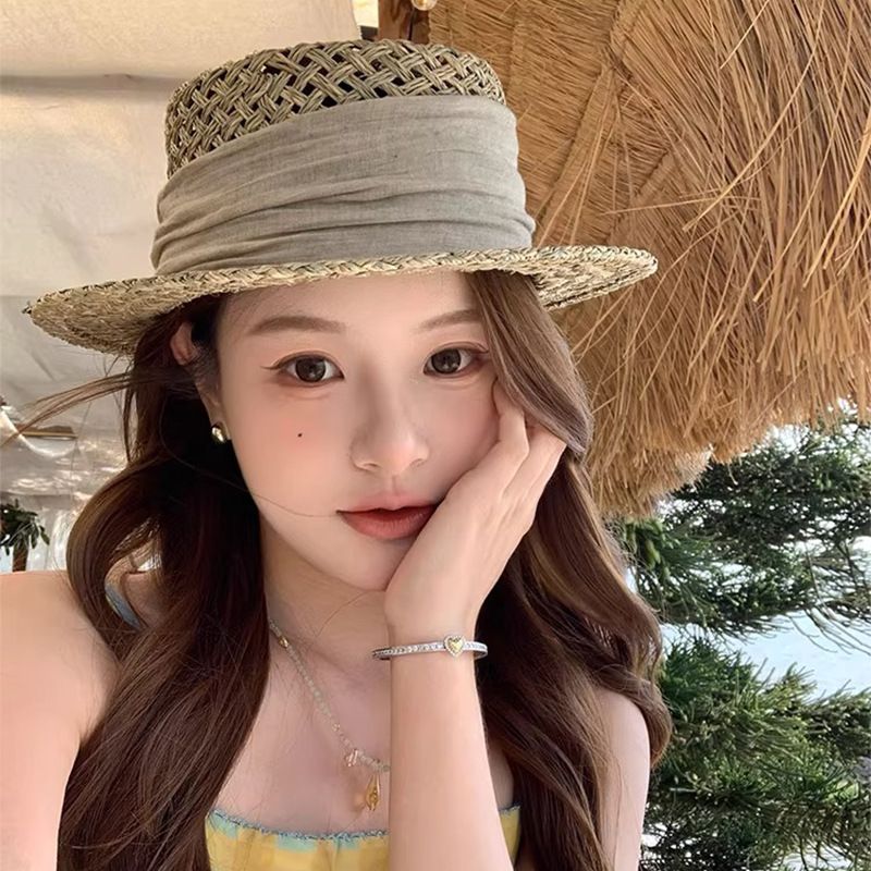 Cappello da spiaggia in paglia da donna con bordo piatto francese del 2025