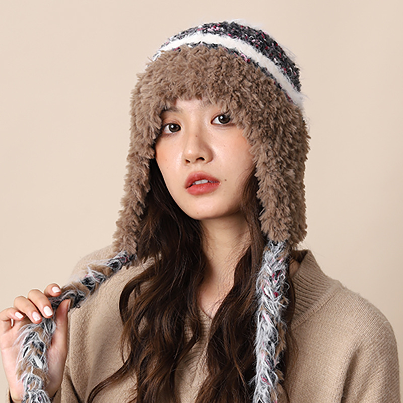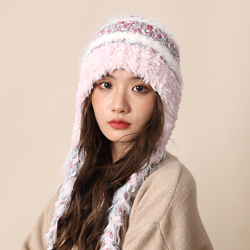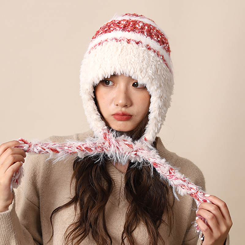 Cappello di lana lavorato a maglia con lacci colorati per donna autunno inverno nuovo caldo protezione per le orecchie e fascia per la testa a strisce colorate