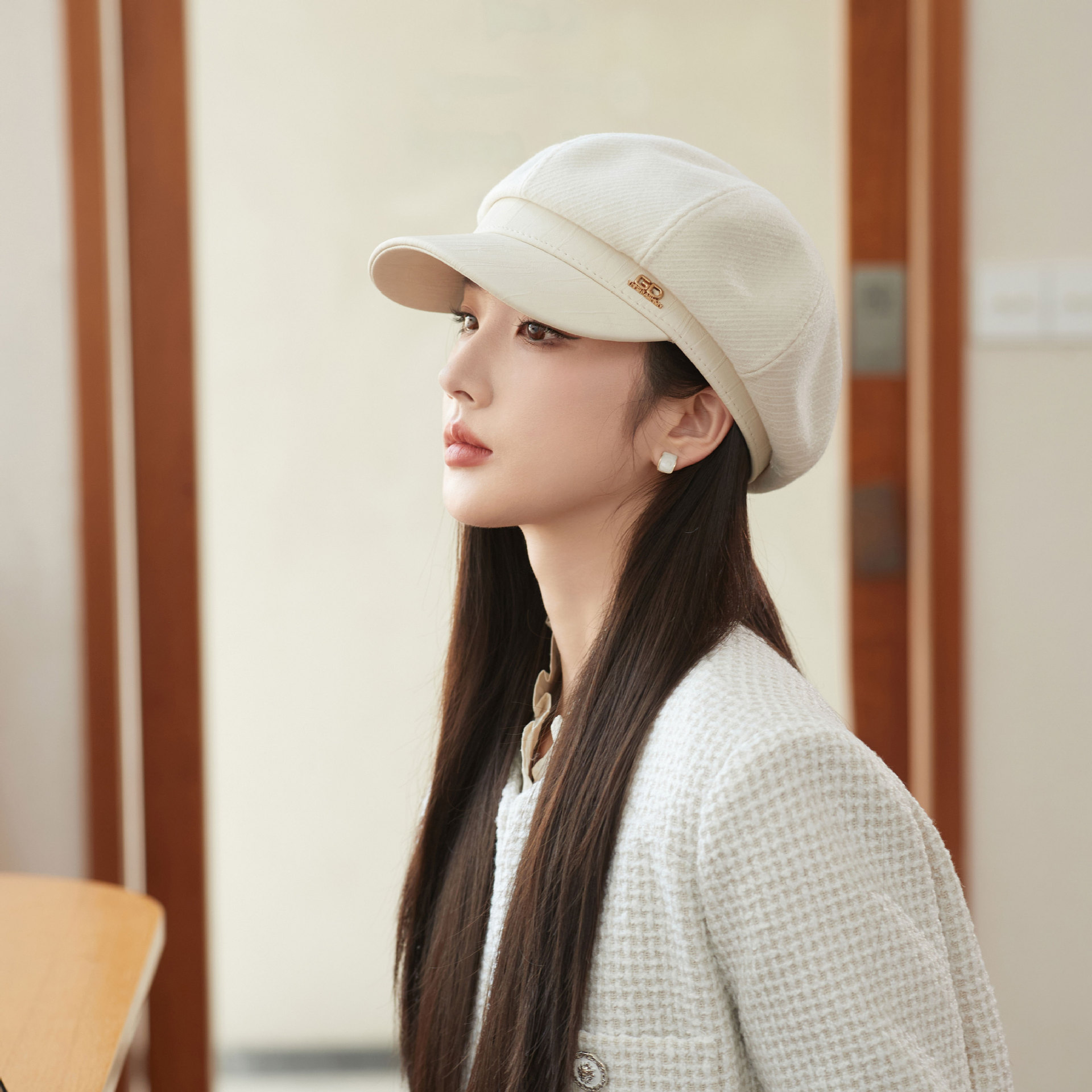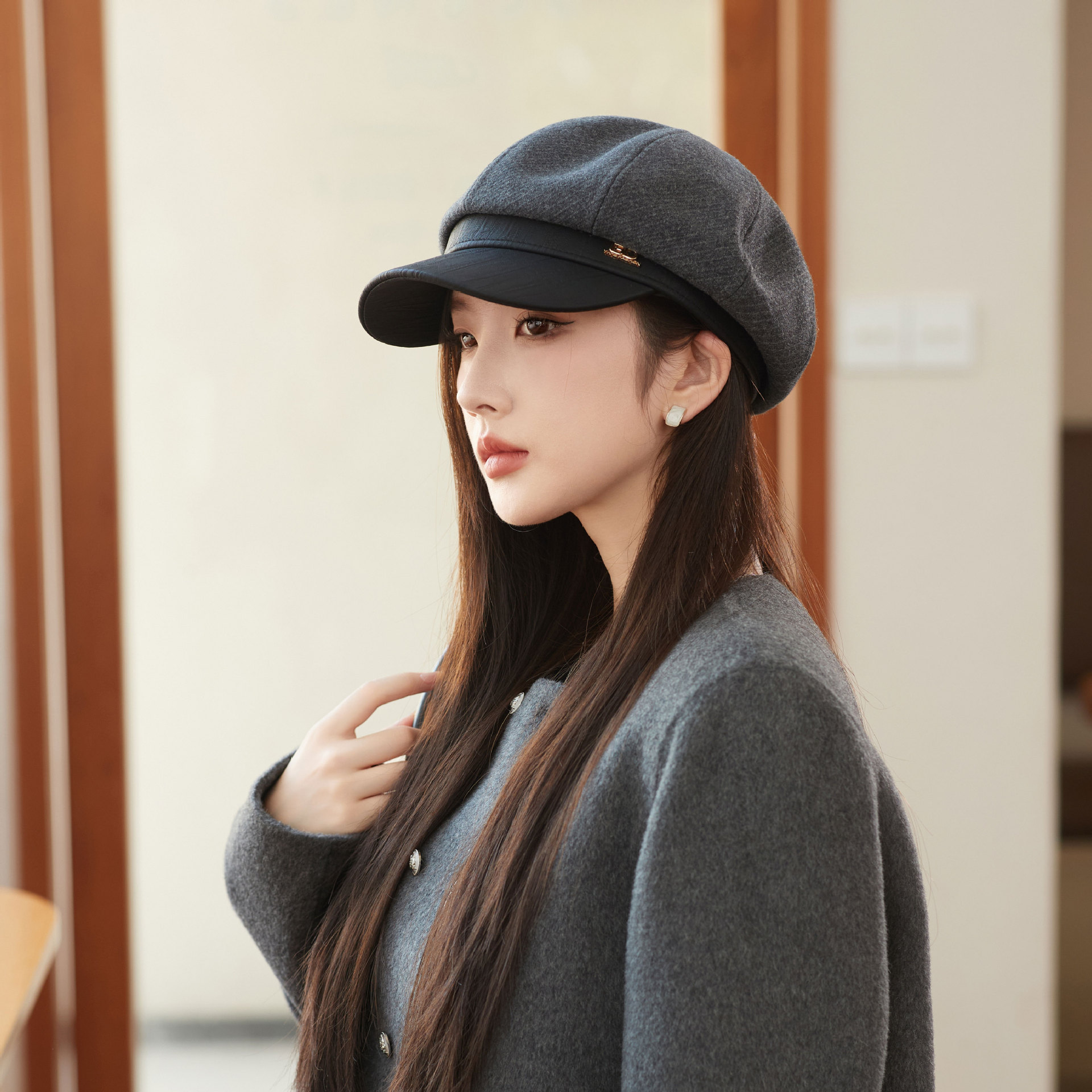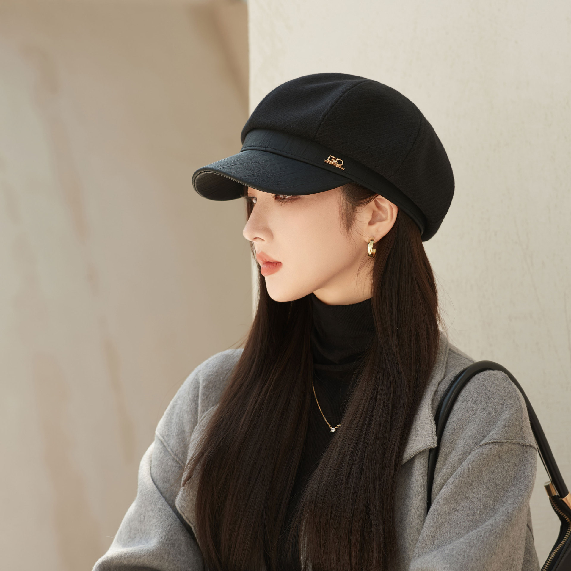 Cappello unisex alla moda in pelle con patchwork ottagonale da donna autunno-inverno vintage nero grande testa rotonda mostra viso piccolo cappello