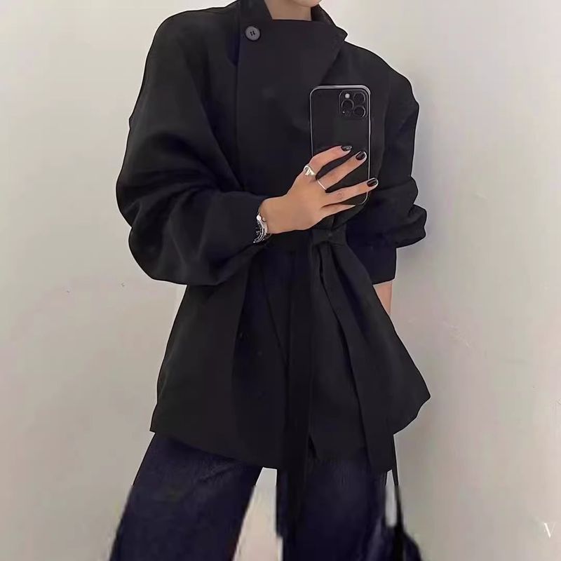 Upgrade your workwear with this stylish high-neck blazer coat, designed for women who want to blend professionalism with modern comfort. The loose fit and adjustable waist belt create a flattering silhouette, perfect for petite frames.