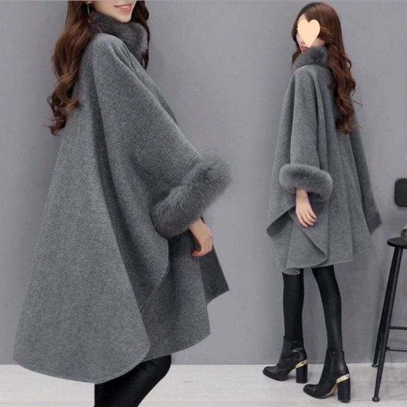 Hepburn Style Woolen Women's Autumn Winter Mid-Length Thickened Wool Coat with Faux Rabbit Fur Collar Women's Cloak Coat