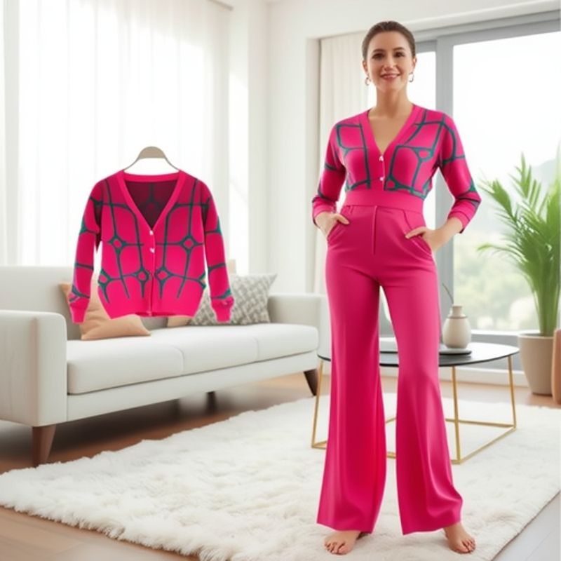 Cardigan a maniche lunghe con gamba larga, da donna, in due pezzi, con motivo a blocchi di colore, piccolo profumo