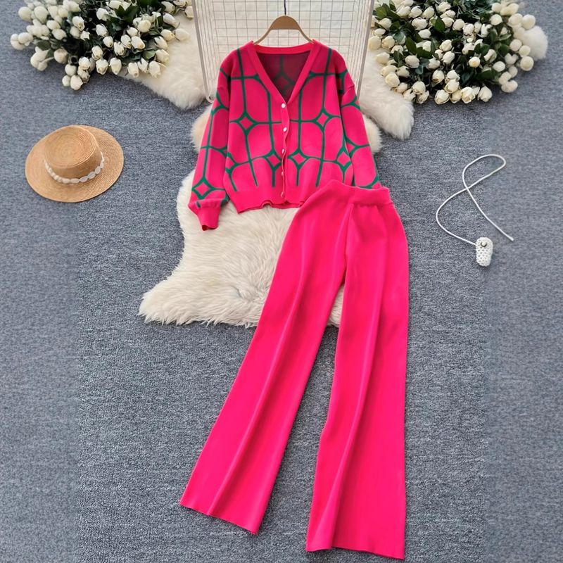 Women's Sweater Knitwear Small Fragrance Style Color-Block Two-Piece Set Fashion Long Sleeve Cardigan Wide-Leg Pants Women's Suit