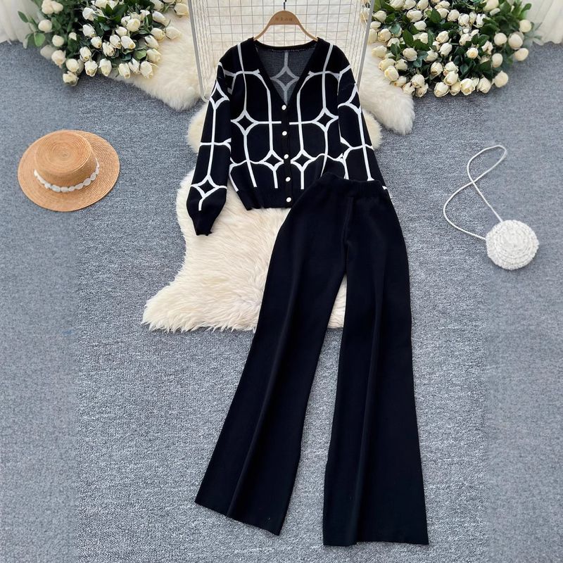 Women's Sweater Knitwear Small Fragrance Style Color-Block Two-Piece Set Fashion Long Sleeve Cardigan Wide-Leg Pants Women's Suit
