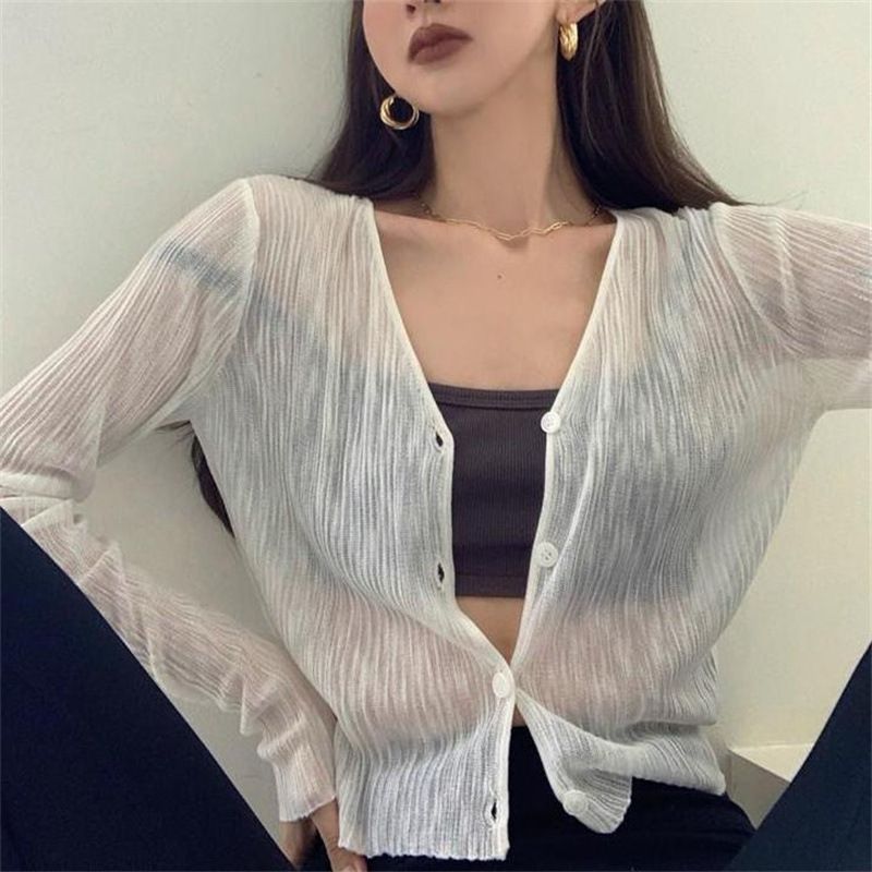 Cardigan con protezione solare per donna 2024, capospalla corto estivo sottile con scollo a V, top bianco lavorato a maglia a maniche lunghe, fabbrica