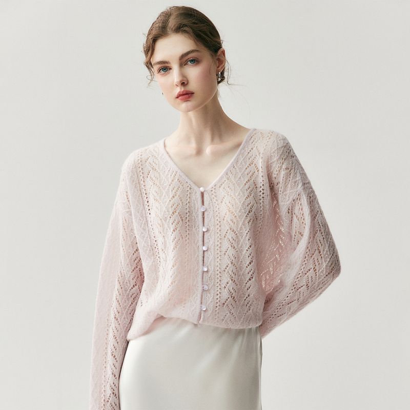 75% Cashmere 25% Mulberry Silk Knitted Cardigan for Women V-neck Hollow Loose Plus Size Thin Sweater Knitted Jacket