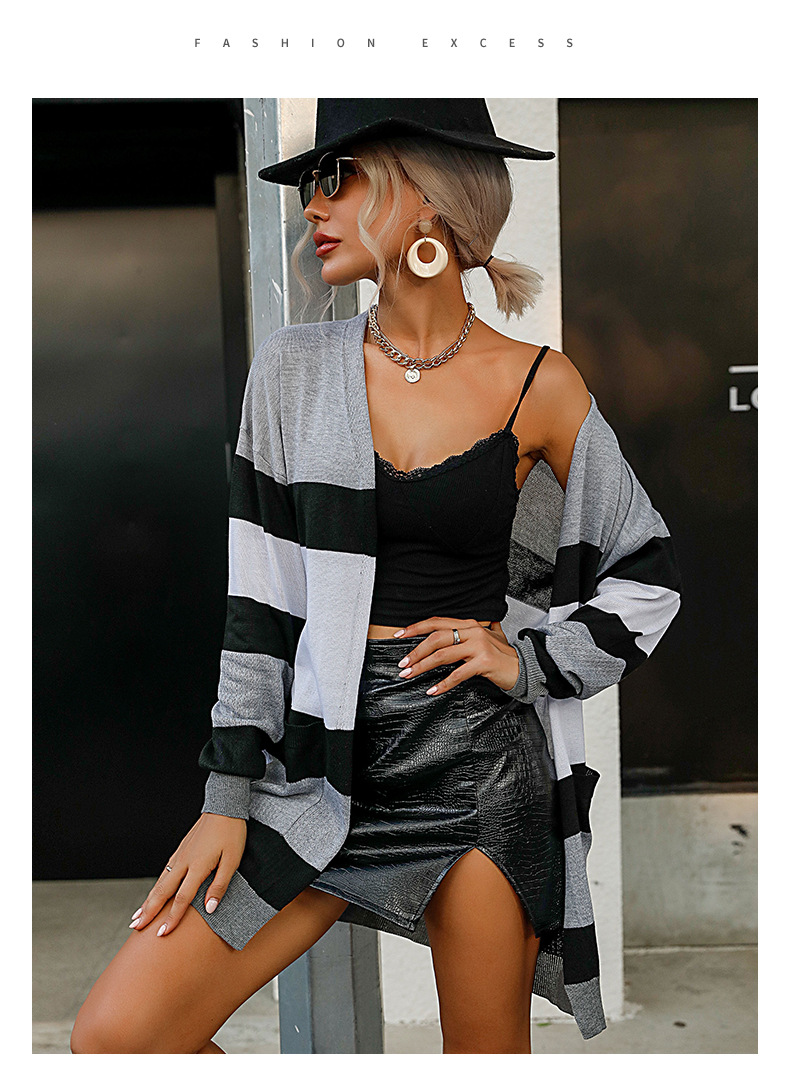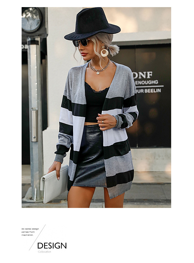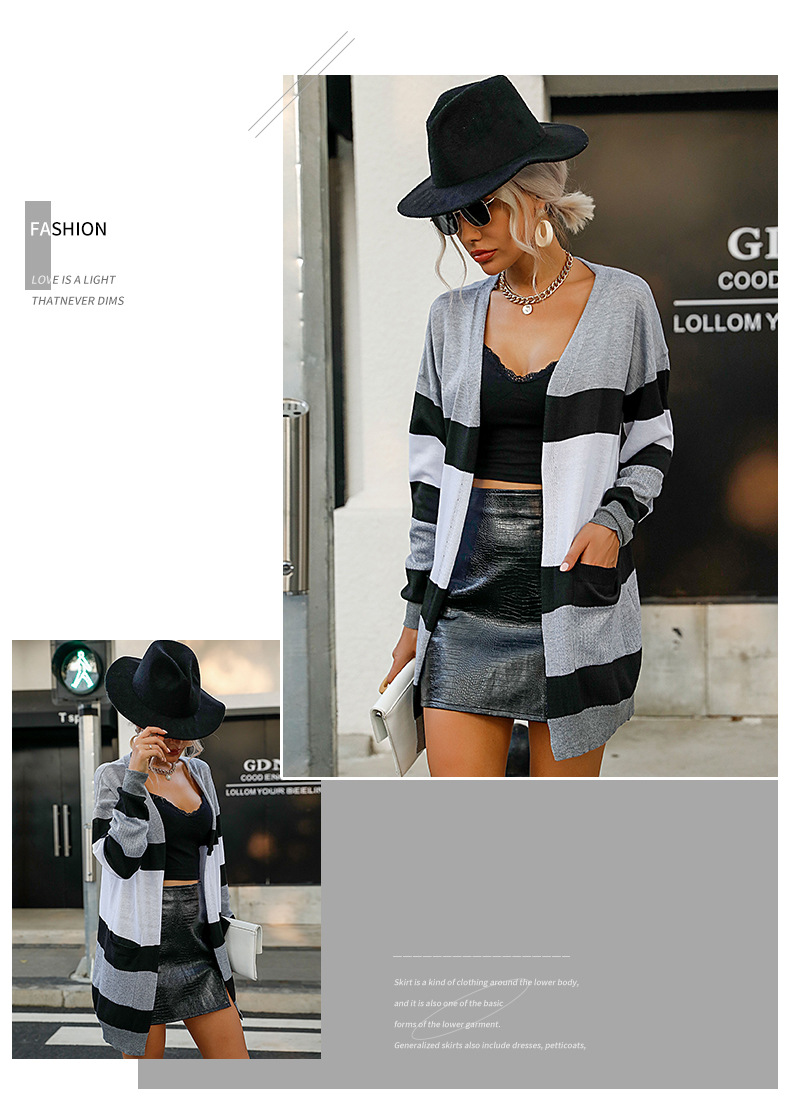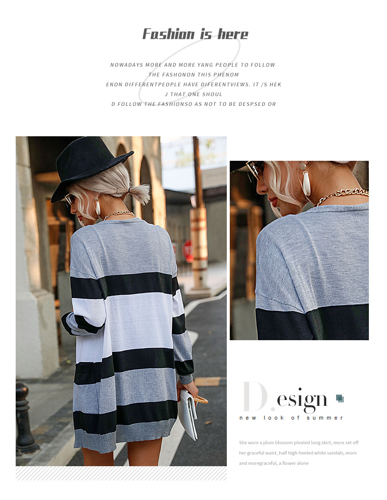 Cardigan maglione casual di media lunghezza con bottoni tascabili a contrasto a righe