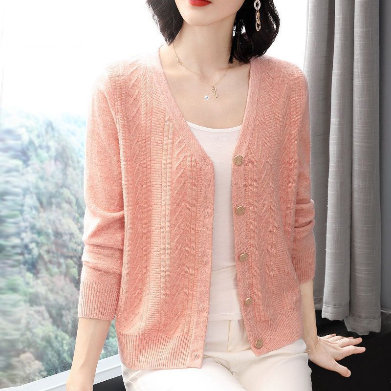 【 Cashmere Family 】 V-neck wool cardigan jacket for middle-aged women, thin knitted sweater for mothers, and short sweater for outerwear