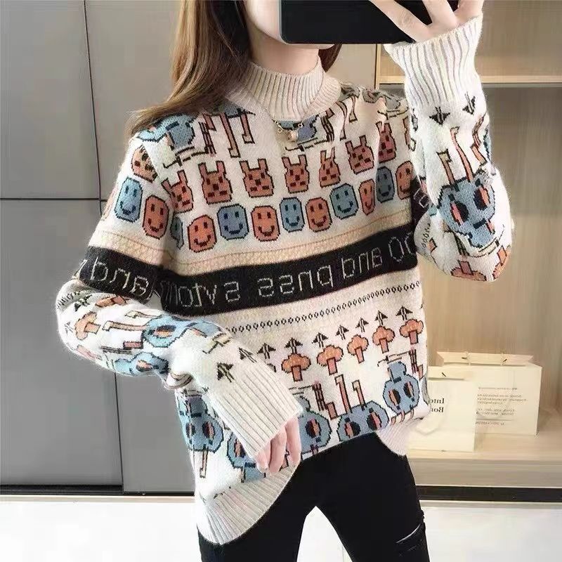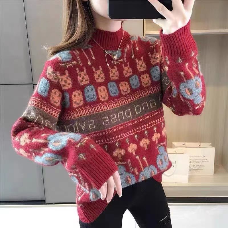 【 Cashmere Family 】 Hooded Half High Neck Sweater Short Loose Wool Base Sweater Women's Thick Knitted Sweater Inner