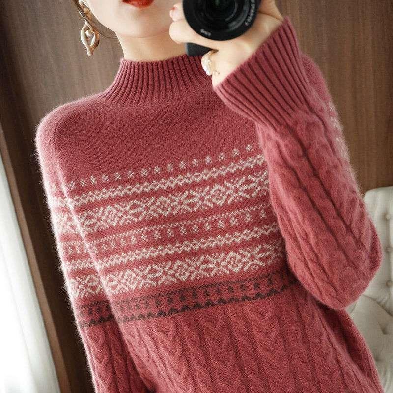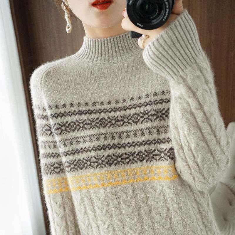 【 Cashmere Family】 Maglione spesso lavorato a maglia da donna, con cappuccio, collo alto e corto, a righe, interno
