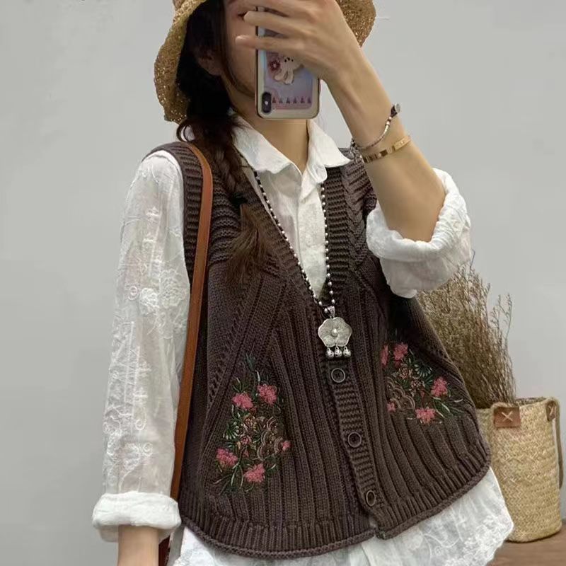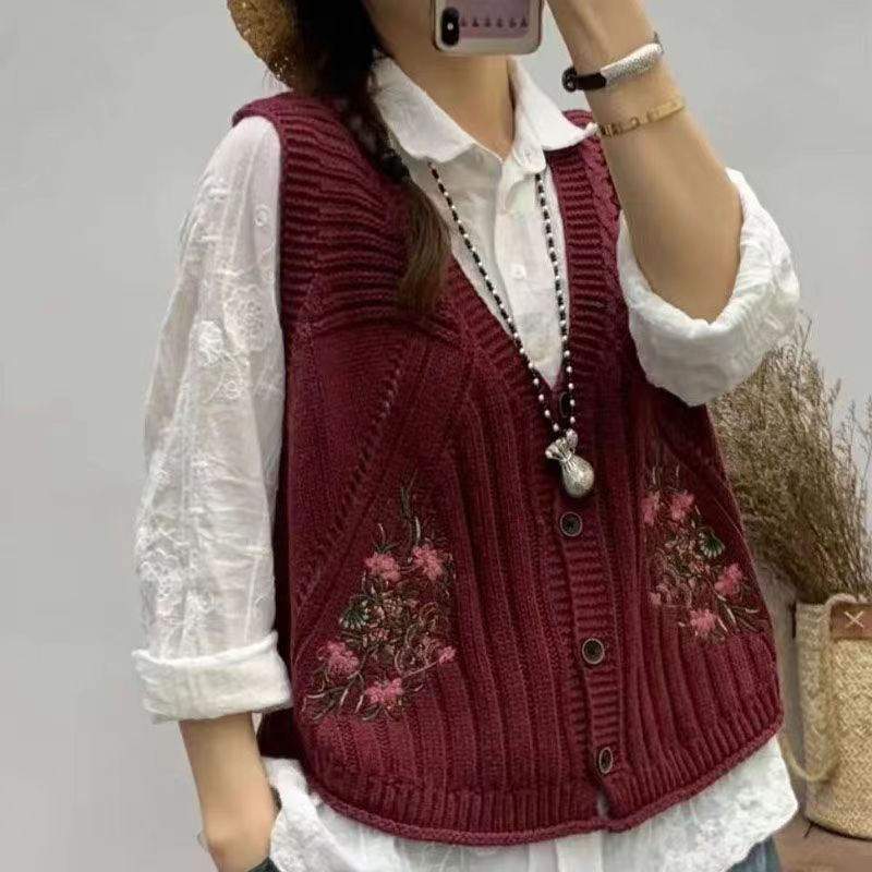 【 Cashmere Family 】 Cardigan in lana con scollo a V, gilet, maglione corto senza maniche ricamato lavorato a maglia, canotta, primavera