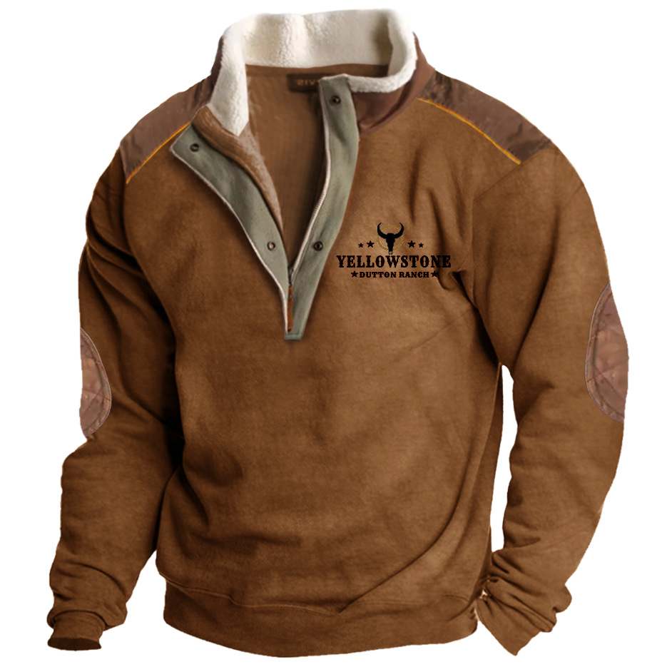 Men's Western Yellowstone English Letter Printed Zipper Stand up Sweatshirt with Half Open Front and Thickened Contrast Color Sweatshirt