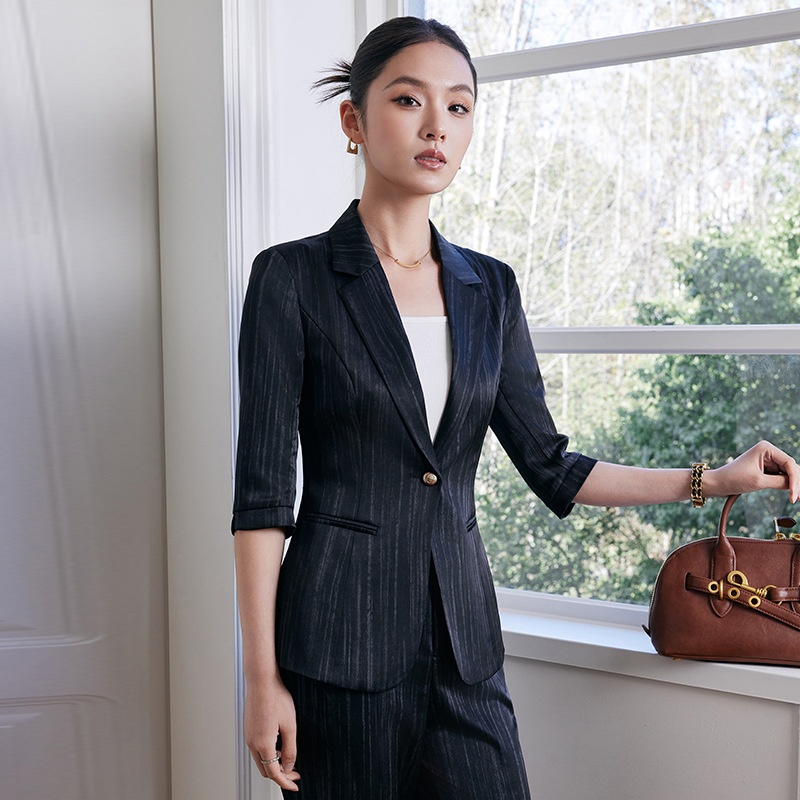 Blazer in raso acetato di alta qualità, manica a tre quarti, a righe, per donna, primavera ed estate, nuovo e professionale, ChicShe