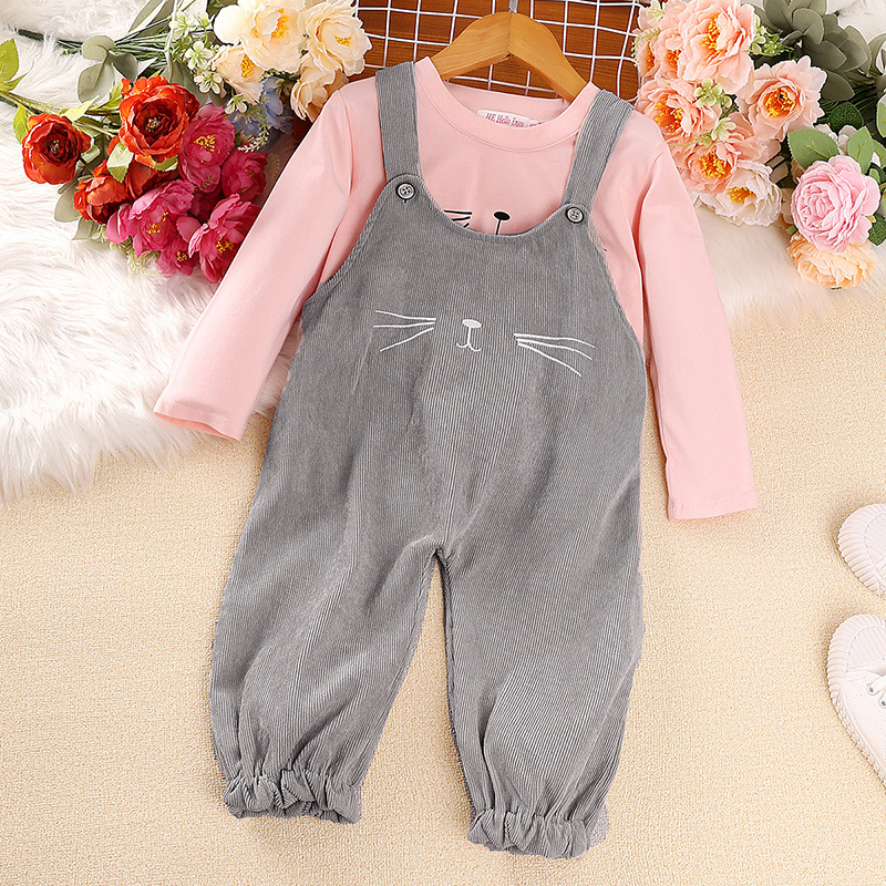 Top a maniche lunghe e pantaloni con bretelle stampati in cartone animato per bambini 2024 in due pezzi per set di abbigliamento primaverile per ragazze
