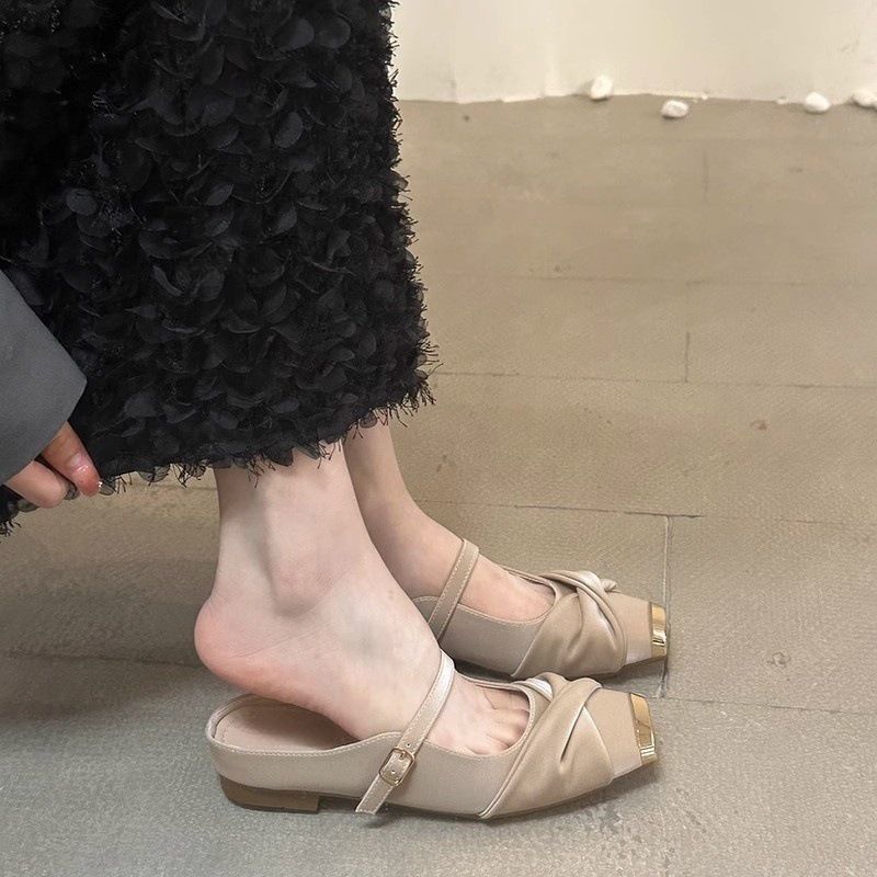 Ciabatte con tacco piatto e punta quadrata in metallo, 2025, primavera, in pelle, suola morbida, per donna, scarpe Mary Jane con un cinturino