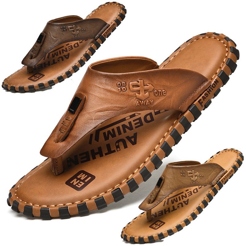 Hand sewn double-layer sole genuine leather top layer cowhide slippers men's flip flops soft outer wear spring beach sandals men's shoes