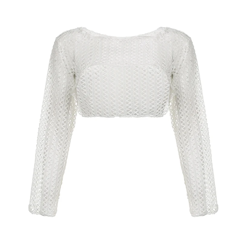 CIBBAR Loose Hollow Out Holes Crop Top Streetwear Y2k Solid Full Sleeve Fishnet Crop Top Smock Women Casual Korean Fashion Tees