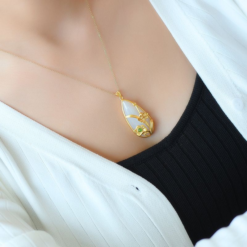 Huidong White Jade Pendant:This necklace features a beautiful Huidong White Jade pendant, known for its pure white color and smooth texture. It adds a touch of elegance and sophistication to any outfit. Fashionable Retro Design:The necklace's design is a perfect blend of fashion and retro elements. The lotus flower and lotus leaf motifs give it a vintage feel, while the golden finish adds a modern touch. High-Quality Material:Made with high-quality materials, this necklace is durable and long-lasting. The Huidong White Jade pendant is a precious gem that can withstand daily wear and tear. Versatile Accessory:This necklace is a versatile accessory that can be paired with a variety of outfits. Whether casual or formal, it adds a touch of class and style to your look. Elegant and Simple Style:The necklace's simple yet elegant style makes it a great piece for anyone. It's easy to wear and complements any outfit, making it a must-have piece in every jewelry collection. Perfect Gift Option:This beautiful necklace makes a perfect gift for birthdays, anniversaries, or just because. It's a thoughtful present that is sure to be appreciated by the recipient.